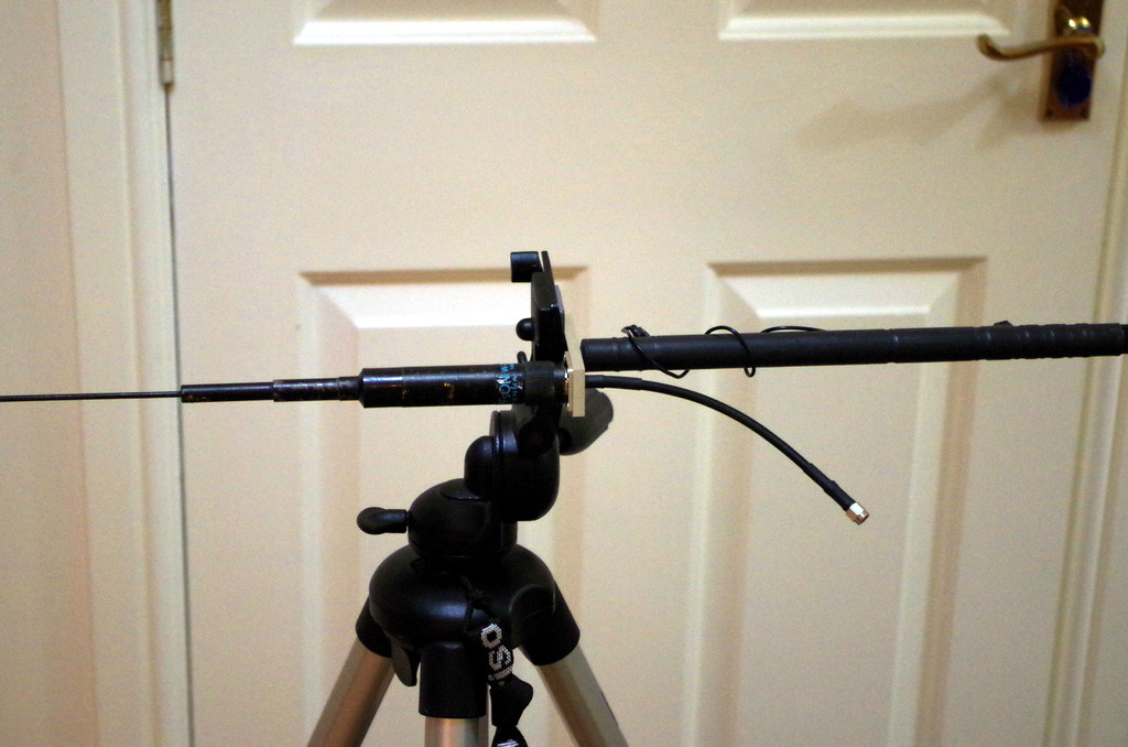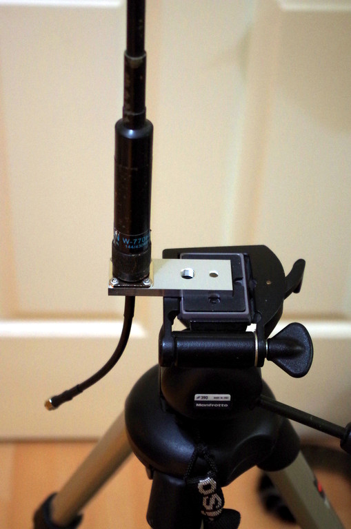 The SO239 in this case is RG58 crimped, and then heatshrink sleeved. The cable is ~15cm to an SMA plug for portability. The smaller hole is 1/4 UNC to attach to the tripod. The larger hole is 3/8 UNF to attach to most small antenna studs.